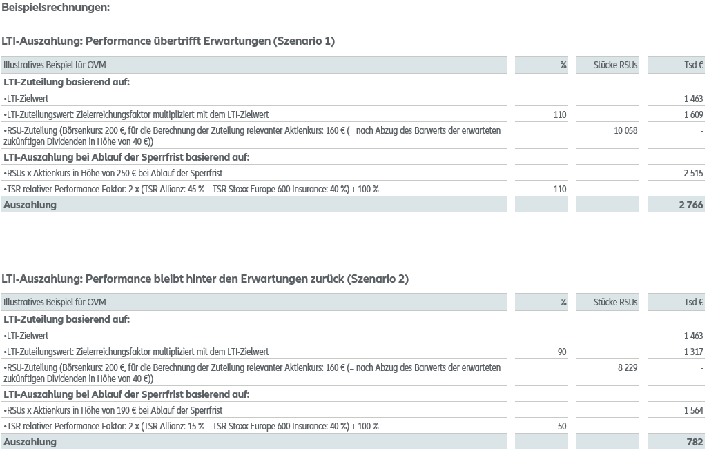 Nach Ablauf der vierjährigen vertraglichen Sperrfrist erfolgt eine Barauszahlung; diese basiert auf dem durchschnittlichen Xetra-Schlusskurs der Allianz Aktie an den ersten zehn Handelstagen nach der Bilanzmedienkonferenz im Jahr der jeweiligen RSU-Fälligkeit, multipliziert mit dem relativen TSR-Performance-Faktor und gegebenenfalls angepasst um das Ergebnis der Nachhaltigkeitsprüfung. Der Wert des Ausübungskurses kann maximal 200% des Zuteilungskurses betragen. In gleicher Weise ist der relative TSR-Performance-Faktor auf maximal 200% begrenzt. Unter Berücksichtigung der allgemeinen Vergütungsobergrenze (EUR 6.000 Tsd. für ein ordentliches Vorstandsmitglied und EUR 11.750 Tsd. für den Vorstandsvorsitzenden) ist der LTI-Auszahlungsbetrag relativ zum LTI-Zielwert – abweichend von der Begrenzung der einzelnen LTI-Komponenten – insgesamt limitiert, und zwar auf maximal 272%.