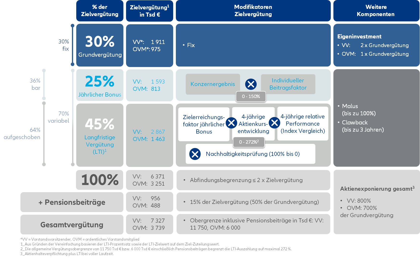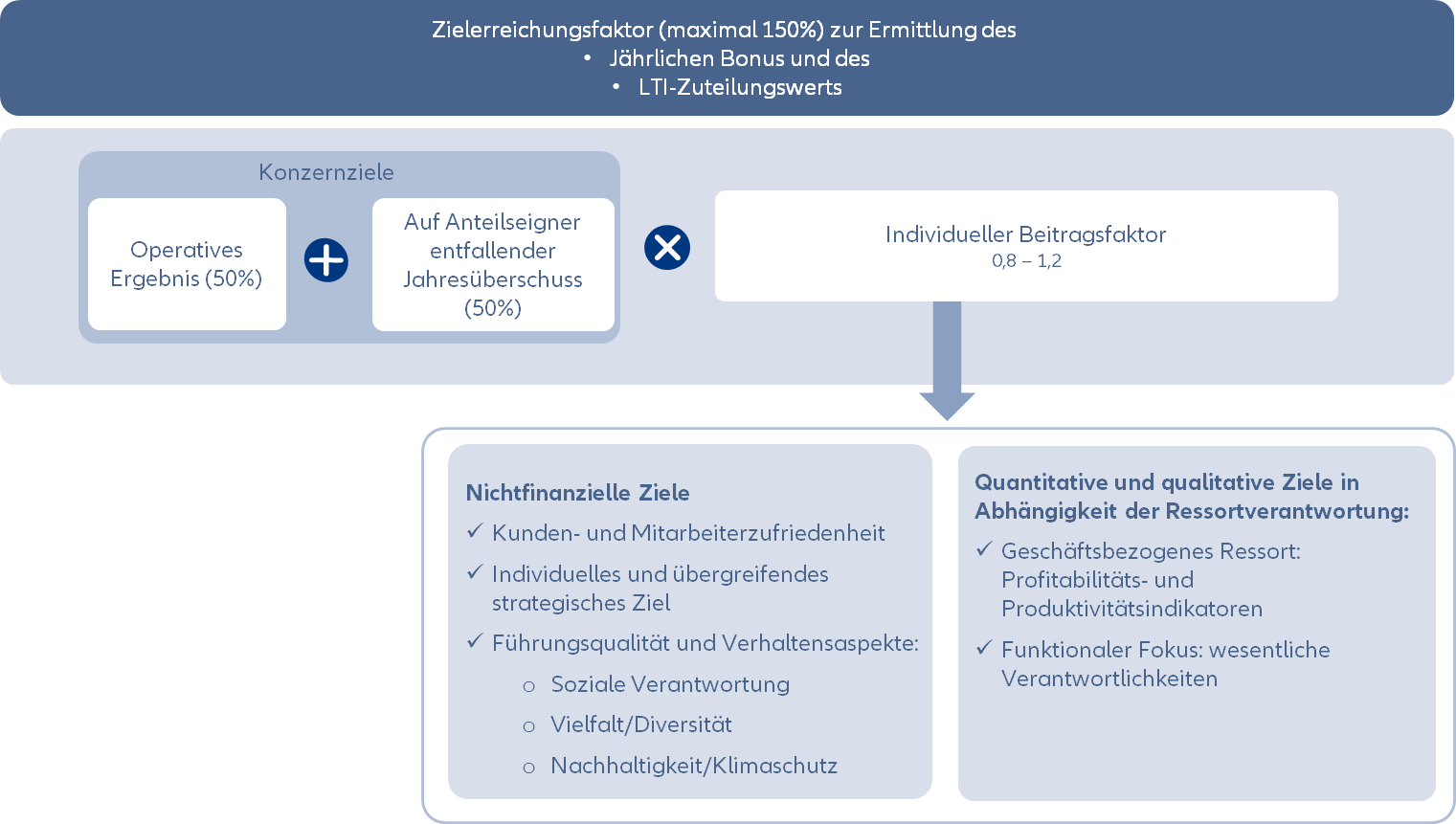 Entsprechend dem übergeordneten Strategieziel „Simplicity wins“, folgt die Ermittlung der variablen Vergütung einem einfachen System. Der jährliche Bonus sowie die LTI-Zuteilung hängen von nur zwei finanziellen Konzernzielen für das entsprechende Geschäftsjahr ab: Operatives Ergebnis und den auf Anteilseigner entfallenden Jahresüberschuss, je zu 50%. Die sich so ergebende Zielerreichung wird durch den individuellen Beitragsfaktor, welcher einerseits die Ergebnisse des Geschäftsbereichs und andererseits die individuellen Leistungen der Vorstandsmitglieder bewertet, mit einem Faktor zwischen 0,8 und 1,2 angepasst. Werden die Ziele nicht erreicht, kann die variable Vergütung bis auf null sinken. Werden die Ziele deutlich übertroffen, so ist der Zielerreichungsfaktor auf maximal 150% begrenzt.