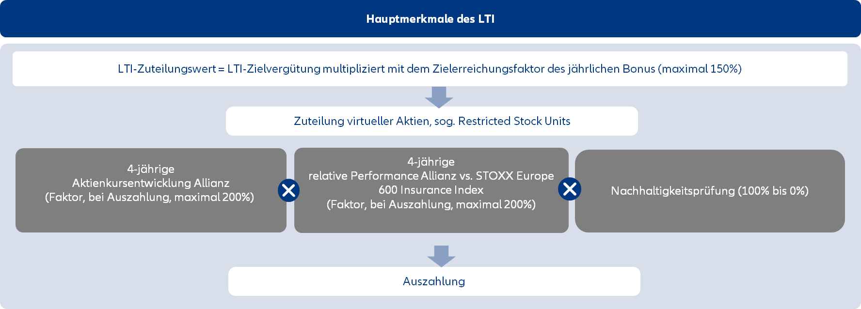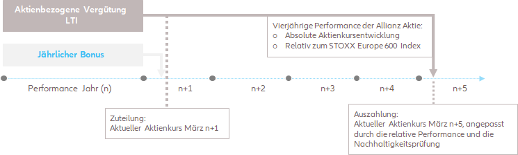 Auf die Zuteilung folgt eine vertragliche Sperrfrist von vier Jahren. Nach deren Ablauf wird die Auszahlung des LTI in Abhängigkeit der relativen Performance der Allianz Aktie, des entsprechenden Aktienkurses und der Nachhaltigkeitsprüfung festgelegt.
