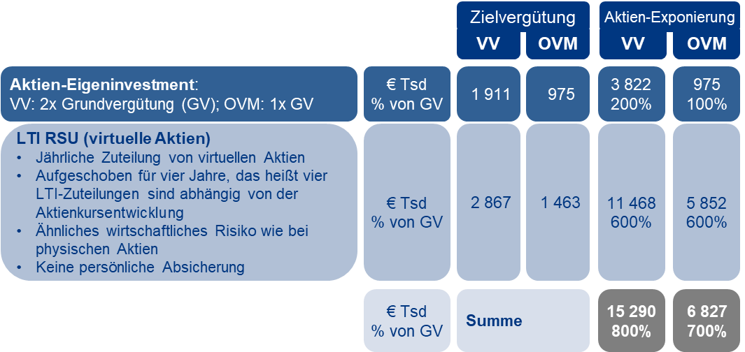 In Verbindung mit den virtuellen Aktien (RSUs), die im Rahmen des LTI über vier Jahre zugeteilt und gehalten werden, ist die wirtschaftliche Exponierung des Allianz SE Vorstands gegenüber Allianz Aktien signifikant. Sie entspricht circa 800% der Grundvergütung für den Vorstandsvorsitzenden bzw. circa 700% der Grundvergütung für ein ordentliches Vorstandsmitglied: