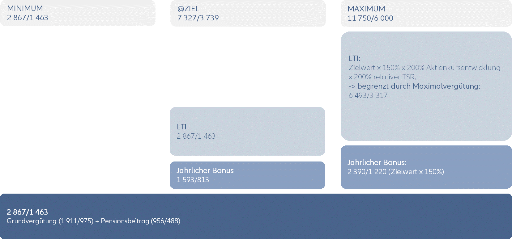 Zudem unterliegt die Gesamtvergütung einer allgemeinen Obergrenze: Pro zugrundeliegendem Geschäftsjahr wird eine Vergütung (bestehend aus variabler Vergütung, Grundvergütung und Versorgungsaufwand) in Höhe von maximal EUR 6.000 Tsd. für ein ordentliches Vorstandsmitglied und von maximal EUR 11.750 Tsd. für den Vorstandsvorsitzenden ausbezahlt:
