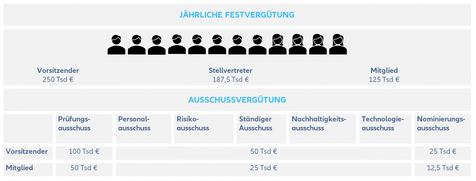Die Vergütung der Aufsichtsratsmitglieder besteht aus einem festen Betrag, der zeitanteilig nach Ablauf eines Quartals des laufenden Geschäftsjahres ausgezahlt wird. Reguläre Aufsichtsratsmitglieder erhalten eine jährliche Festvergütung in Höhe von EUR 125.000. Der Vorsitzende des Aufsichtsrats wird mit EUR 250.000 vergütet, seine Stellvertreter jeweils mit EUR 187.500.