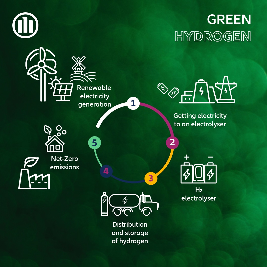 Überschüssige Energie, die während der Sonnenscheindauer und an Tagen mit starkem Wind erzeugt wird, kann zur Erzeugung von Wasserstoff genutzt werden. Dieser kann dann wochen- oder sogar monatelang gespeichert und an Tagen, an denen der Himmel bedeckt ist oder sich die Turbinen nicht drehen, wieder in Strom umgewandelt werden. Wenn Wasserstoff in großem Maßstab und ohne Freisetzung von CO2 hergestellt werden kann, bietet er eine Möglichkeit zur Dekarbonisierung einer Reihe von Sektoren - einschließlich des Fernverkehrs, der chemischen Industrie und der Beton- und Stahlproduktion -, in denen es sich als schwierig erweist, die Treibhausgasemissionen zu reduzieren.