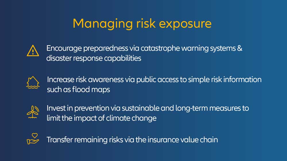 Letztendlich ist es eine Kombination aus Versicherung und Vorsorge, die die Gesellschaften langfristig schützen wird, insbesondere im Hinblick auf einen langen Kampf gegen den Klimawandel. Für Klaus-Peter Roehler, Mitglied des Vorstands der Allianz SE, ist klar, dass eine intelligente Zusammenarbeit unerlässlich ist. "Eine tragfähige Lösung erfordert einen ganzheitlichen Ansatz, eine Zusammenarbeit zwischen Wissenschaft, Wirtschaft und Politik, aber auch auf der Ebene des Einzelnen", sagt Roehler. "Sie muss Elemente wie individuelle Prävention, intensiven Hochwasserschutz, ein Umdenken in der Bau- und Flächennutzungsplanung, Warn- und Rettungssysteme sowie Versicherungslösungen für die breite Bevölkerung und deren Bezahlbarkeit beinhalten. Politische Unterstützung ist vor allem bei Starkregen- und Überschwemmungsrisiken unerlässlich. Hier spielen strenge Baubeschränkungen in Überschwemmungsgebieten eine zentrale Rolle, ebenso wie Hochwasserschutz und Flussgebietsmanagement".