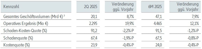 Im zweiten Quartal 2025 erhöhte sich das gesamte Geschäftsvolumen auf 20,1 (2Q 2024: 19,3) Milliarden Euro. Das interne Wachstum war mit 8,7 Prozent sehr gut, wobei sowohl das Gewerbe8 – als auch das Privatkundengeschäft9 ein solides Wachstum verzeichneten. Die Allianz hat ihr Geschäftsvolumen erfolgreich gesteigert und dabei ihre Zeichnungsdisziplin beibehalten.