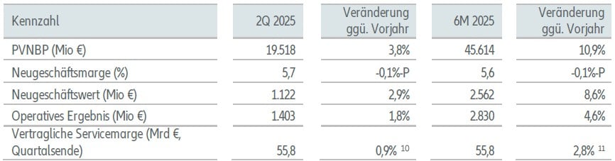 Im zweiten Quartal 2025 stieg der PVNBP, der Barwert der Neugeschäftsbeiträge, auf 19,5 (2Q 2024: 18,8) Milliarden Euro. Das Wachstum war breit gestreut und 93 Prozent (93 Prozent) der Neugeschäftsbeiträge wurden in unseren bevorzugten Geschäftszweigen erzielt.