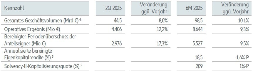 In ersten Halbjahr 2025 stiegen die operativen Erträge auf 4,1 (6M 2024: 4,0) Milliarden Euro, was einem internen Wachstum von 3,8 Prozent entspricht. Dieser Anstieg war auf höhere Erträge aus dem verwalteten Vermögen zurückzuführen in Folge eines höheren durchschnittlichen für Dritte verwalteten Vermögens.