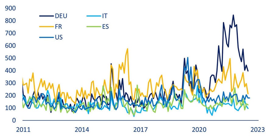 Germany’s transformation process is already in full swing. Companies have begun to leave Germany for locations with cheaper energy. Nevertheless, the German government has proposed an 80% electricity price subsidy for heavy industry (Industriestrompreis), which carries a EUR30bn price tag – though this is not yet decided. It has also drafted subsidy plans for clean production in heavy industry worth around EUR20bn and EUR20bn of subsidies have already been earmarked for chip production plants, of which EUR10bn alone will go to Intel. Yet, it remains to be seen whether this will be enough to drive private investments in Germany, the way investments associated with the Inflation Reduction Act contrary have pushed up new plant investments in the US (Figure 13).