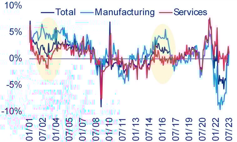 This is clearly a trend to monitor in the coming months as a wage-price loop could become a real risk if real wage growth is positive during three out of the next four quarters, i.e. until mid-2024. The IMF has identified two such episodes in the past in the UK (2003, 2016), much less than in the US, which has seen six such episodes (1973, 1978, 1987, 1996, 2000 and 2017). Belgium and Germany, where wage growth is also currently very dynamic, have seen four (1999, 2005, 2010 and 2016) and three (1989, 2010 and 2017), respectively. As 2024 is a political year, we expect the minimum wage to be raised by at least another 7% after 9.7% this year, against inflation forecasts of 3.5% and 7% respectively, which means an acceleration in terms of the real wage growth. Total real wage growth is expected to reach a cumulative +3.9pps, compared to -3.1% in 2022 (Figure 7).