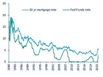 - The US housing market is adjusting to the new reality of higher-for-longer interest rates. Interest rates are rising rapidly – the Fed delivered a third consecutive 75bp hike during the September FOMC meeting – and unlikely to decrease much in 2023 as the FOMC will be keen to restore its inflation-fighting credibility. In this context, the pass-through from higher Fed Funds rates to mortgage rates today is the strongest since the early 1980s.