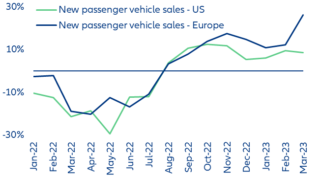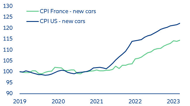 car prices show no sign of cooling down in the US. Tesla, the world’s largest battery-electric vehicle (BEV) manufacturer, announced another round of substantial price cuts in Europe and North America. Last year, rising new and second-hand car prices (up +7% and +11%, respectively) played a major role in driving headline inflation figures, contributing to the record profits reported by dominant carmakers. Tesla’s move, while significant at a micro level, is unlikely to have any substantial impact at a macro level. With about 30,000 cars registered in France in 2022, the company’s market share is rising but remains below 2%. Since January 2023, the two rounds of price cuts have brought the bill for entry-level versions of its Model 3 and Model Y down by -10% and -21%, respectively. Factoring in the company’s market share, sales mix and the announced priced cuts, and keeping all else unchanged, we find that the announced price cuts would bring down the total French new car price index by just -0.3%. Overall, France recorded a +7.3% increase y/y in March 2023. Applying the same process to the US, we find that lower Tesla prices would have a -0.5pp deflationary impact but overall new car prices still rose by +6.6% (Figure 5).