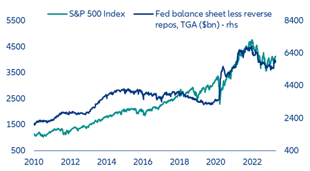 - The Fed is on track to deliver a 25bps rate hike – the last of this cycle. The unwelcome increase in liquidity – fueled by the banking crisis and the debt ceiling drama – gives the Fed even more reason to keep rates high for the next few months before a pivot later this year (-25bps in November and -50bps in December) to 4.5% from a peak of 5.25%.