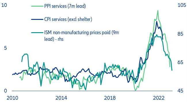 Tighter lending conditions and recession... As we argued recently, the maximum impact of monetary tightening will likely be reached between the middle of 2023 and early 2024, supporting our call of a recession in the second half of 2023. This is because rapidly tightening bank credit standards since the middle of 2022 should eventually lead to a pull-back in new loans to the private sector in the second half of the year, according to usual lags. We also think that property price declines are not over yet, with adverse effects on consumption spending, which will start to show by early 2024. Our estimates show that tightening credit conditions and falling house prices should be enough to push the US economy into a recession.