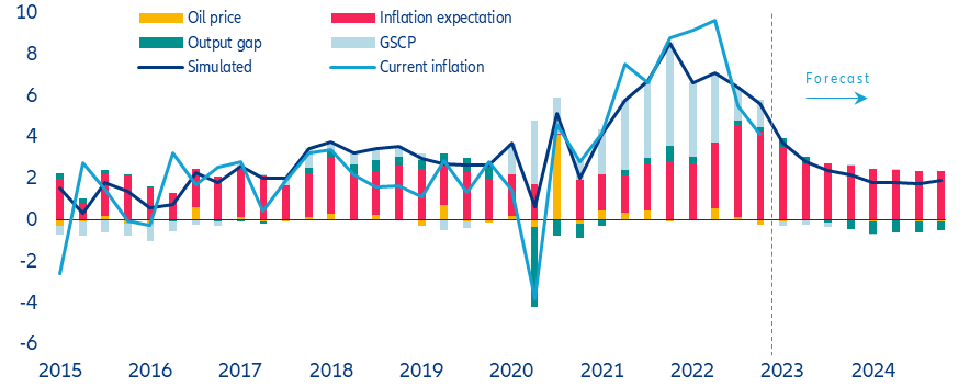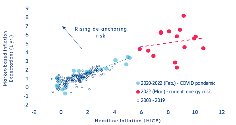 Despite rapidly declining energy inflation, the broadening of price pressures still creates a challenging environment for monetary policy in the Eurozone. In March, headline inflation declined to 6.9% y/y (-1.6pps relative to February), the lowest rate since the start of the war in Ukraine in February 2022. However, core inflation rose to a record 5.7% y/y (+0.1pp). Selling-price expectations show a clear divergence between goods and services. While goods inflation moderated, suggesting that the easing in supply bottlenecks and falling energy prices have started to feed through, price pressures for services remain strong. Nonetheless, the breadth of inflation marginally narrowed, with the share of inflation components registering (y/y) price increases above the ECB’s 2% target declining to 89% (-2pps). In addition, the risk of de-anchoring inflation expectations has declined − consumer expectations have eased while market- and survey-based inflation expectations (ECB’s Survey of Professional Forecasters (SPF) and Survey of Monetary Analysts (SMA)) have remained stable. We expect headline inflation to average 5.6% this year and 2.6% next year.