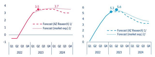 - The steady decline in headline inflation over the last five months (to 6.9% y/y in March) will not be enough for the ECB to abandon its restrictive monetary stance. The continued increase in core inflation will reinforce the ECB Governing Council’s conviction that further rate increases are still needed to prevent (still) strong wage pressures from embedding higher inflation in the economy. We forecast two more 25bps hikes in May and June for a terminal rate of 3.5% (which remains in place until Q2 2024) despite stagnating growth. There is an upside risk of a 50bps hike if the Q1 growth numbers surprise on the upside and spillover risk from the second round of US banking sector stress remains contained.