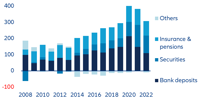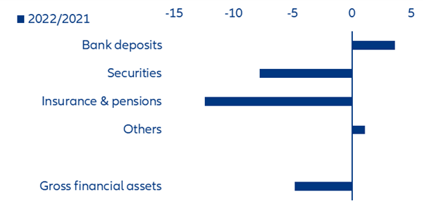 Stocks: The price of the interest-rate turnaround. While assets held in shares clearly felt the effects of the capital market turmoil, debt securities as well as pension and insurance claims suffered particularly from the rising interest rate environment. The losses for securities added up to EUR277.6bn while those of insurance and pension products added up to EUR410.4bn. Year on year, the stocks of assets fell by -7.8% and -12.4%, respectively. Bank deposits, on the other hand, showed robust growth (+3.6%, Figure 7). This asset class is still by far the most popular one in Germany (42.6% of total financial assets), while 30.3% is held in insurance & pension assets and 26.7% in securities (Figure 8).