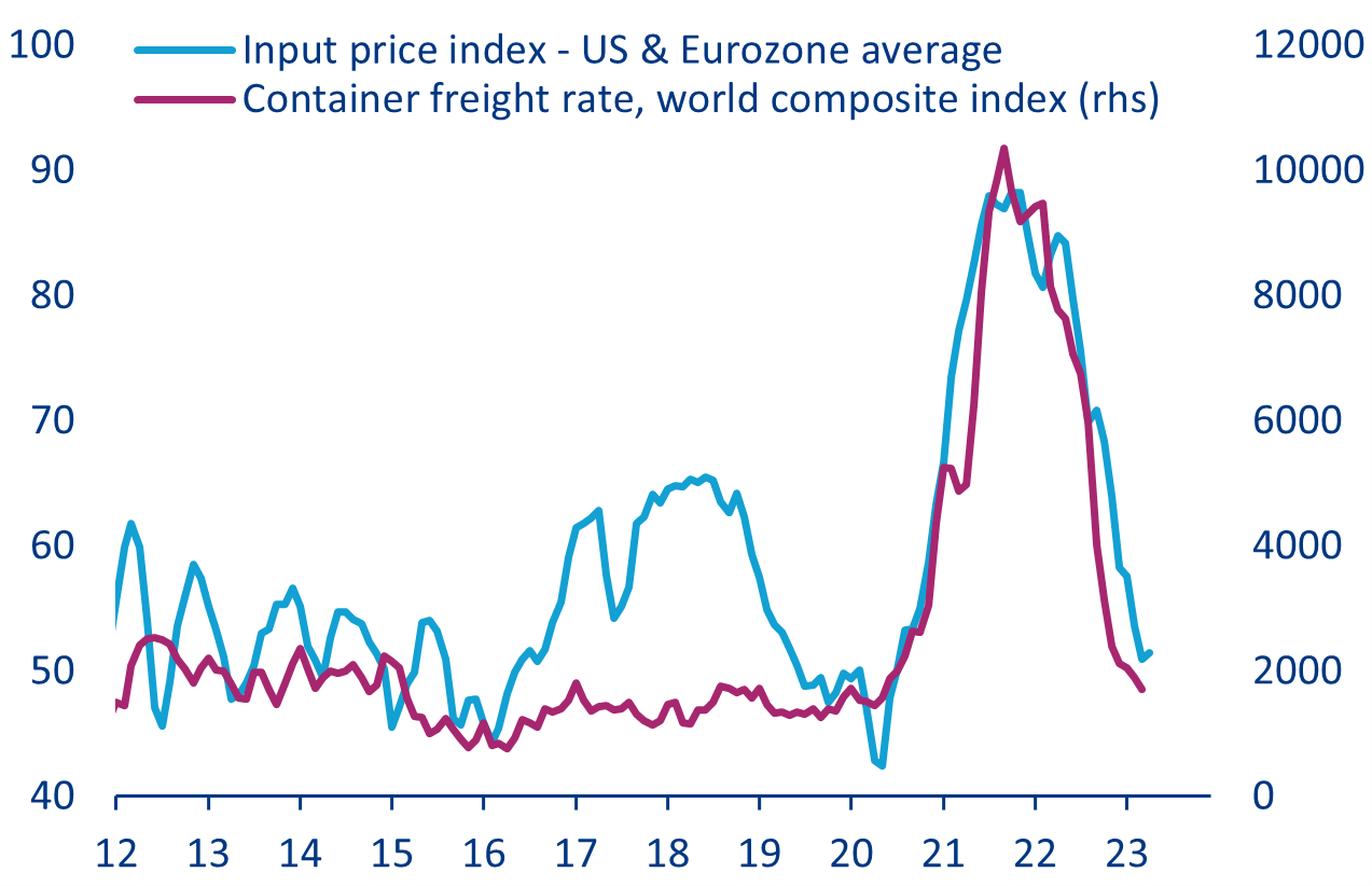 In contrast, the Fed is on track to deliver the last rate hike in this cycle (25bps). Although pressures have built in recent days on First Republic bank, the FOMC members will be relieved that the banking crisis has somehow stabilized, with overall regional banks seeing a return of deposit inflows in April. At the same time, while there is increasing evidence that inflationary pressures have started to ease (see below), the Fed will continue to focus on still-elevated current core inflation outturns, which rose +5.6% y/y in the March CPI report (+0.1pp from February). The May FOMC meeting will thus provide Fed policymakers with an opportunity to strengthen further their anti-inflation credentials by pushing the target range of the Fed funds target to 5-5.25%.