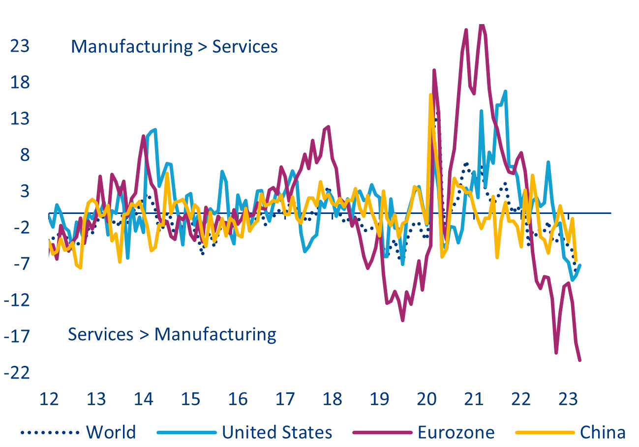 - Ahead of the next round of monetary policy meetings next week, continued banking sector stress raises the question of whether financial stability concerns might alter the policy rate path in the US and the Eurozone, allowing inflation to remain higher for longer. Overall inflation has declined (and more so in the US); however, core inflation is becoming increasingly sticky, especially in the Eurozone where it reached an all-time high of 5.7% y/y in March. Wage pressures increasingly drive higher prices for services. However, the risk of a deflationary shock from bank failures and retrenching credit seems to be getting more serious. As money supply keeps contracting, it is hard to see a relapse of inflation, even though some bumps along the way of normalizing prices cannot be ruled out.