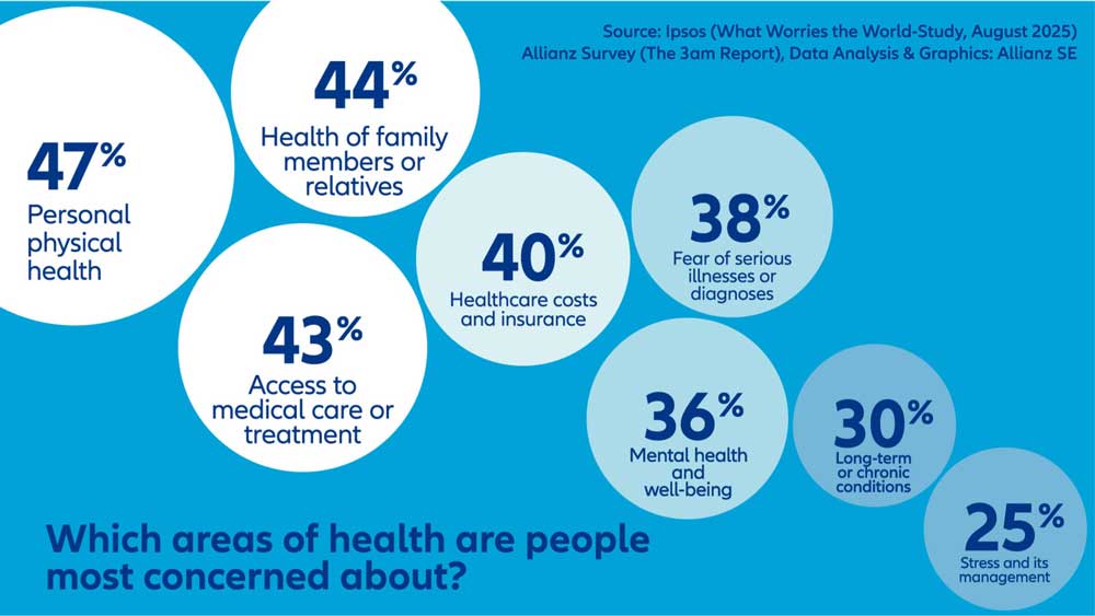 When it comes to health, people worry most about their own physical wellbeing (47%), the health of family members (44%), and access to medical care and treatment (43%) across all countries. Unlike overall worries, health-related fears vary more strongly from country to country. Germans are the only group particularly concerned about long-term and chronic conditions, while people in Turkey are most afraid of serious illnesses. Brazilians are especially troubled by mental health (ranked #2 overall), which also appears among the top five worries in Australia, the UK, Indonesia, and Turkey. Australians and Indonesians are particularly worried about the cost of healthcare, whereas in France, healthcare access is the most pressing issue. The health of family members is also a major concern in France, the UK, Indonesia, and Italy.