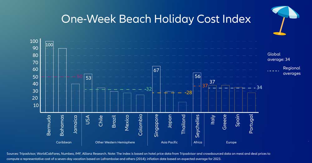 - Bermuda remains the most expensive beach holiday destination, nearly three times as expensive as Southern Europe.